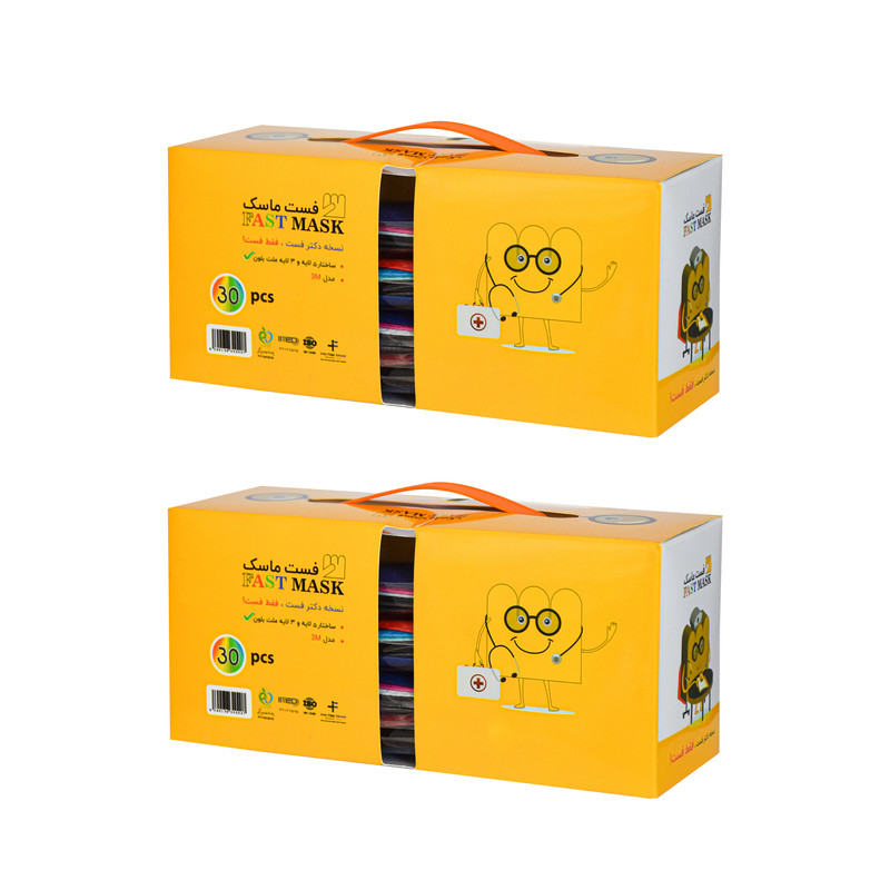 ماسک تنفسی دکتر فست مدل 3 بعدی 5 لایه رنگارنگ FAST-KF94، سه بسته 30 عددی. مجموعا 90 ماسک سه بعدی کودک مناسب برای کودکان 8 الی 16 سال. دارای لایه ملت بلوند