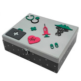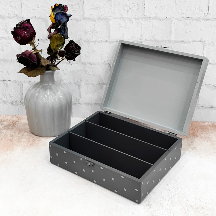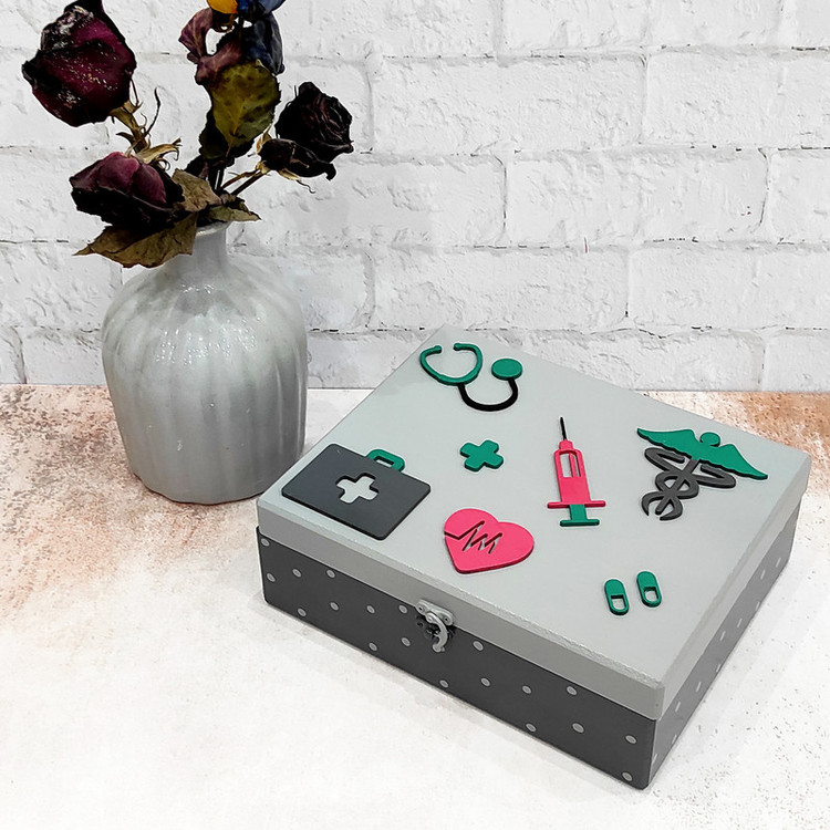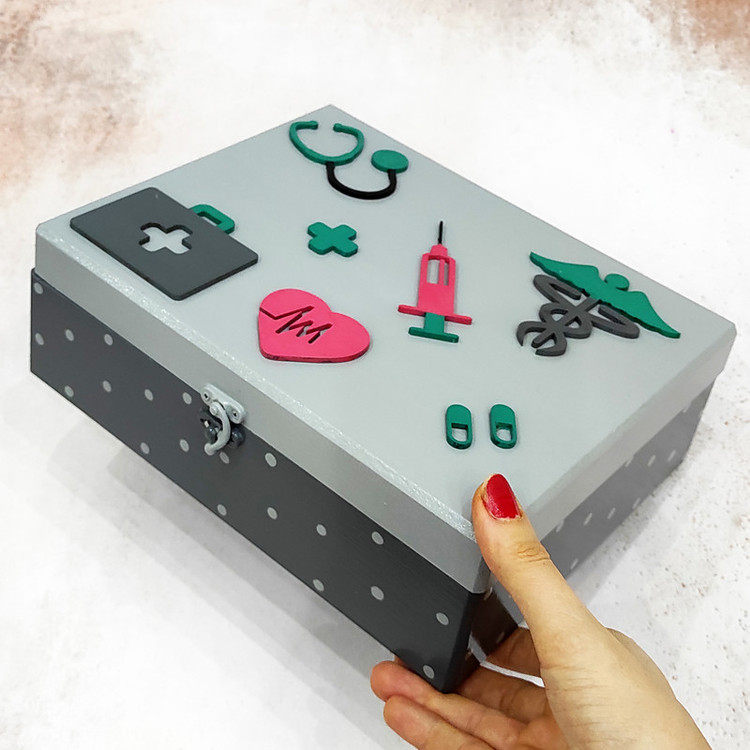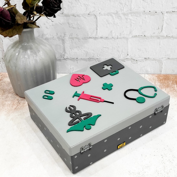 این محصول زیبا و چشم نواز شامل یک جعبه چوبی دارو ،در سایز 20x25 با ارتفاع 8 است و دارای سه تقسیم داخل خود است که به مرتب شدن لوازم داخل آن کمک میکند و تقسیم ها قابل برداشته شدن است.این محصول مناسب برای نگه داری از داروها و شربت های داخل منزل و یا اداره است داخل آن لوازم کمک های اولیه موجود نیست.رنگ جعبه طوسی روشن و تیره و طرح برجسته روی آن که المان های مخصوص هستند، در چند رنگ چشم نواز کار شده است .تمامی سطح محصول بعد از رنگ شدن با مواد باکیفیت و مرغوب ضد آب شده است که باعث میشود چوب باد نکند و وقتی درمعرض رطوبت قرار میگیرد پوسته پوسته نشود.این محصول زیبا برای خرید جهیزیه فوق العاده است امیدوارم با خرید این محصول علاوه بر رفع نیاز ،از زیبایی ،دست ساز بودن و هنر ایرانی نیز لذت ببرید.
