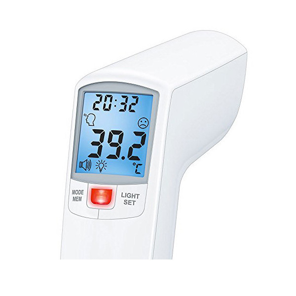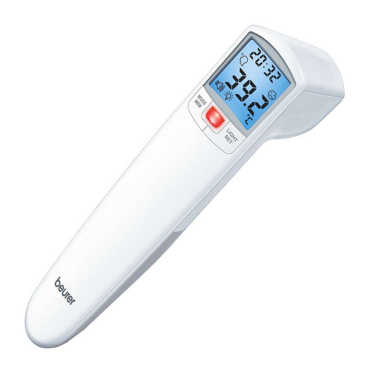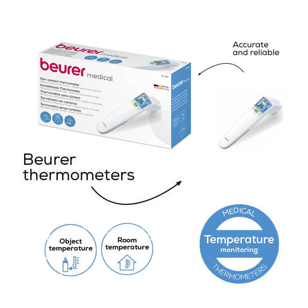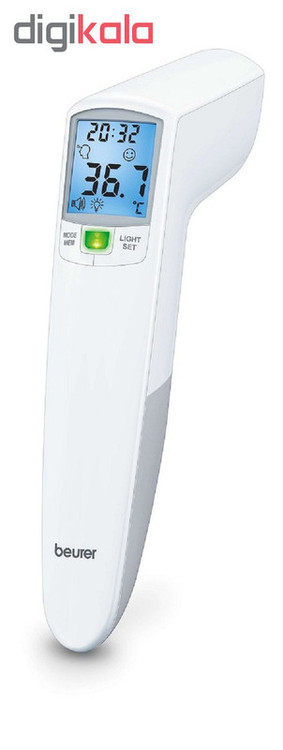 کمپانی آلمانی Beurer که از سال 1919 در امر تولید تجهیزات پزشکی سابقه دارد، نمونه های مختلفی از تب سنجهای دیجیتال را به بازار عرضه کرده است. تب سنج دیجیتال بیورر مدل FT100 قابلیت سنجش دمای بدن، دمای محیط و دمای سطح را دارد. برای این تب سنج سنسور فاصله تعبیه شده تا بدون نیاز به تماس، بتوانید دمای بدن افراد به خصوص نوزادان و کودکان را اندازه گیری کنید. این تب سنج دمای بدن را با چراغ LED به شما هشدار می دهد. بدین صورت که تا دمای 37.9 درجه را با چراغ سبز و دمای بالای 38 درجه را با چراغ قرمز نشان می دهد. سیستم اندازه گیری دمای این تب سنج با مادون قرمز بوده و سریعا دما را اندازه گیری کرده و پس از اندازه گیری به شما هشدار صوتی می دهد. تب سنج دیجیتال بیورر مدل FT100 دما را به صورت فارنهایت و سانتی گراد نشان می دهد. این تب سنج دما را از فاصله ی 4 تا 6 سانتی متری اندازه گیری می کند. این محصول همچنین دارای 60 جایگاه حافظه می باشد که می توانید دمای بدن را ذخیره کنید. تب سنج دیجیتال بیورر مدل FT100 دارای نمایشگر بزرگ و خوانا با نور آبی است که به راحتی می توانید دمای اندازه گیری شده را مشاهده کنید. از دیگر قابلیت های این دستگاه می توان به خاموشی خودکار، کنترل صدا و دقت بالا اشاره کرد. منبع تغذیه این دستگاه دو عدد باتری 1.5 ولتی است که به هنگام خریداری به همراه یک کیف در اختیار شما قرار می گیرند. دقت اندازه گیری این تب سنج برای پیشانی تا 0.2 سانتی گراد و در محدوده های دیگر 0.3 سانتی گراد می باشد.