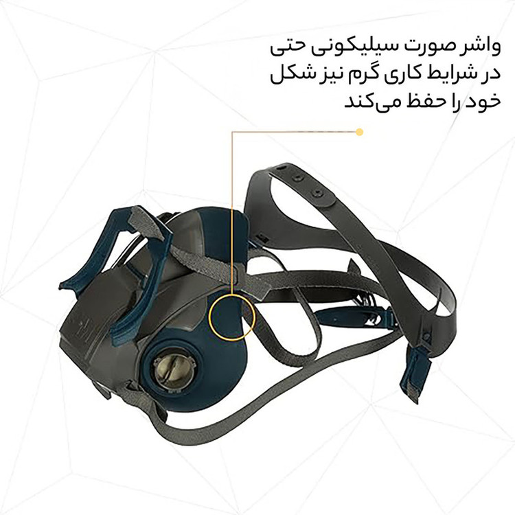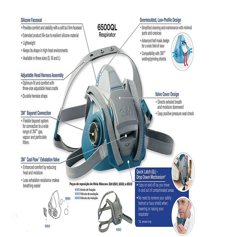 این ماسک از سیلیکون ساخته شده و دارای طراحی منحصر به فردی می باشد. سبک ترین ماسک سیلیکونی 3M، سری QL6500 Respirator که دارای راحتی و ثبات ماندگاری در حین استفاده توام با نرمی و پایداری است.تنفس راحت تر با طراحی جدید از 3M ماده سیلیکون مقاوم در برابر انبساط در محیط های با گرمای زیاد، که می تواند به افزایش عمر محصول کمک کند. سازگار با انواع جوشکاری ها و هر نوع مواد شیمیایی ،محیط بیمارستانی، به راحتی در حال حرکت و خارج از مناطق آلوده با ضامنی که در زیر ماسک تعبیه شده ماسک آزاد می گردد و فشار از روی صورت بر داشته می شود. شستن و تمیز کردن ماسک محدودیتی ندارد. طول عمر محصول به دلیل مواد سیلیکونی مقاوم بالاست. شکل خود را در محیط های گرم نگه می دارد. این محصول ارائه شده مدل QL6502 سایز M است .دقت داشته باشید که متاسفانه در بازار این محصول با همین شکل با نسخه کپی (غیر اصلی) موجود و عموما فروخته می شود، محصول ارائه شده اورجینال و اصلی شرکت 3m تولید شده در کشور چین است. سایز ماسک موجود مدیوم می باشد که به عموم صورت ها می نشیند .محصول با فیلتر 6006و پد و کاور N95 عرضه می شود.