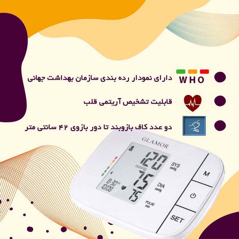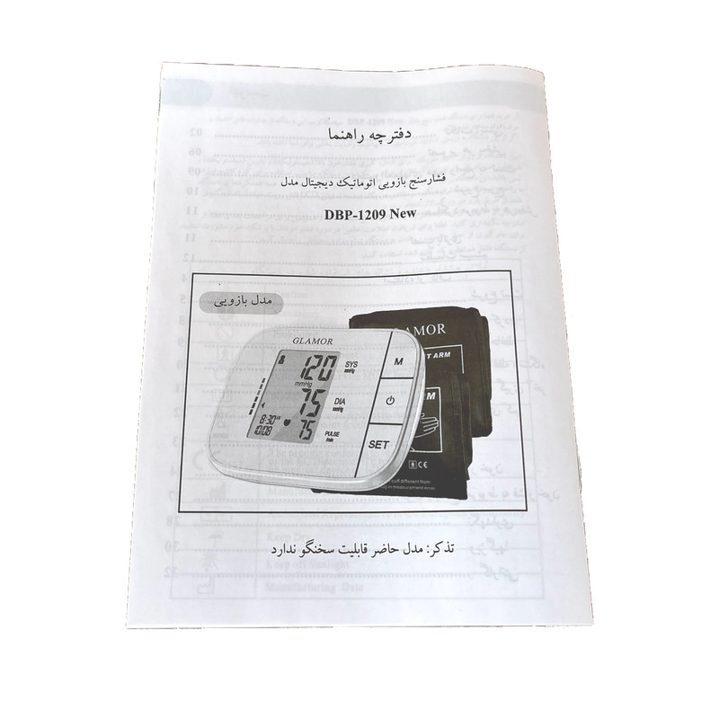 با توجه به خطراتی که با بالا و پایین شدن فشار خون انسان را تهدید میکند، داشتن یک فشارسنج، بسیار ضروری است. از آن جایی که اغلب افراد طریقه اندازهگیری فشارخون را با دستگاه فشارسنج معمولی (عقربهای) را بلد نیستند، توصیه میشود که از دستگاه فشارسنج دیجیتالی که حتما بازویی باشد، استفاده کنند. دستگاه فشارسنج بازویی گلامور Glamor مدل DBP-1209new شامل یک کیف محکم، یک عدد کاف ساده کوچک ( مناسب برای دور بازوی 22 الی 36 سانتی متر)، یک عدد کاف ساده بزرگ (مناسب برای دور بازوی 22 الی 42 سانتی متر)، آداپتور، دستگاه و دفترچه راهنما است. این دستگاه قادر است هم با برق و هم با باتری کار کند؛ باطری درون پکیج موجود نیست. از قابلیتهای این دستگاه میتوان به اندازهگیری دقیق فشار خون به صورت 180 ضربه در دقیقه و میزان فشار خون را از 30 تا 250 میلیمتر جیوه نشان میدهد. همچنین این فشارسنج دارای حافظه است و میتواند برای دوکاربر مجزا تا 60 بار میزان حافظه بیمار را در خود ذخیره کند.فشارسنجهای دیجیتال به دلیل دقت بالاتر و سرعت بیشتر در اندازهگیری فشار خون، انتخاب بسیاری از افراد میشوند. این دستگاهها معمولا دارای صفحه نمایش دیجیتال هستند که به صورت دقیق و روشن اطلاعات اندازهگیری شده را نمایش میدهند، در حالی که فشارسنجهای آنالوگ بیشتر بر پایه خوانایی نوک قلمی و نشانگرهای متحرک عمل میکنند. نحوه کار با فشارسنج دیجیتال بازرویی گلامور این فشارسنج دیجیتال بازرویی گلامور با استفاده از تکنولوژی برتر، قادر به اندازهگیری دقیق فشار خون است. با استفاده از سنسورهای حساس و پیشرفته، این دستگاه تغییرات فشار خون را به صورت دقیق نمایش میدهد و به شما امکان میدهد تا وضعیت سلامت خود را بررسی کنید. برای استفاده از این فشارسنج، ابتدا باید دستگاه را روشن کرده و منبع تغذیه آن را اتصال دهید. سپس باید منبع تغذیه را به درستی قرار داده و منبع نوری مناسب فراهم کنید تا بتوانید نتایج را به صورت واضح مشاهده کنید. سپس آرنج خود را روی میز قرار داده و منبع نوری را به دستگاه متصل کنید. با فشردن دکمه شروع، دستگاه شروع به اندازهگیری فشار خون میکند و نتایج را نمایش میدهد.