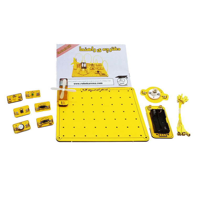 کتابچه آموزشی- 1 عدد صفحه نگهدارنده- 1 عدد موتور الکتریکی- 1 عدد پره- 2 عدد کلید کشویی- 1عدد کلید شاسی- 2 عدد ال ای دی- 1عدد بیزر- 6 عدد سیم سوکت دار- 1عدد جا باتری- 1 عدد لامپ