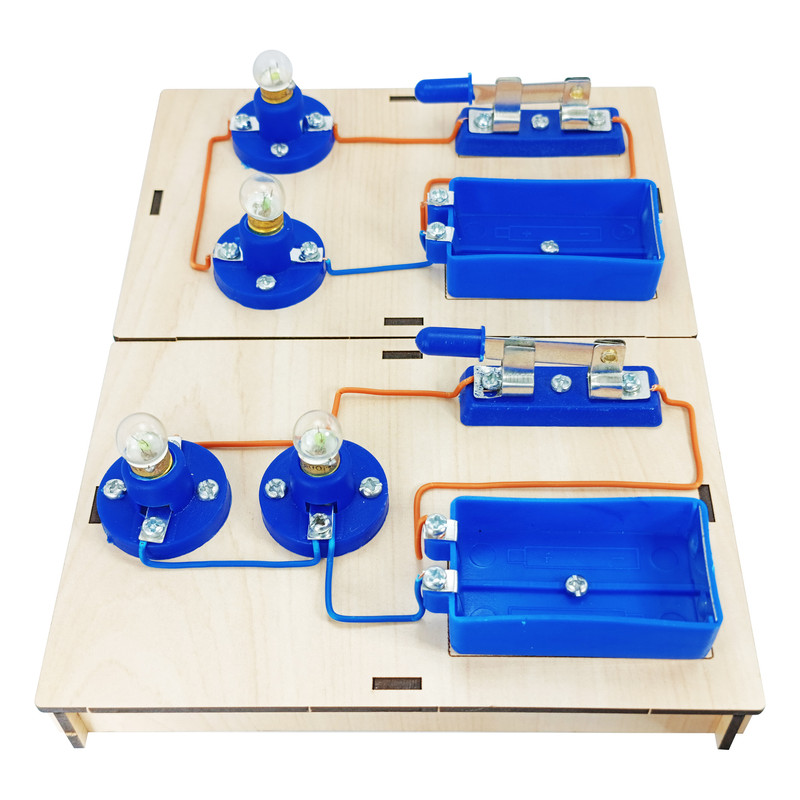 =» کیت کاردستی مدار سری و مدار موازی شامل دو پایه ام دی اف برش خورده دارای سوراخ و جاباتری و کلید و لامپ و سرپیچ و پیچ و … است که شما با استفاده از این لوازم می توانید بصورت مجزا دو مدار موازی و سری را مونتاژ کنید .