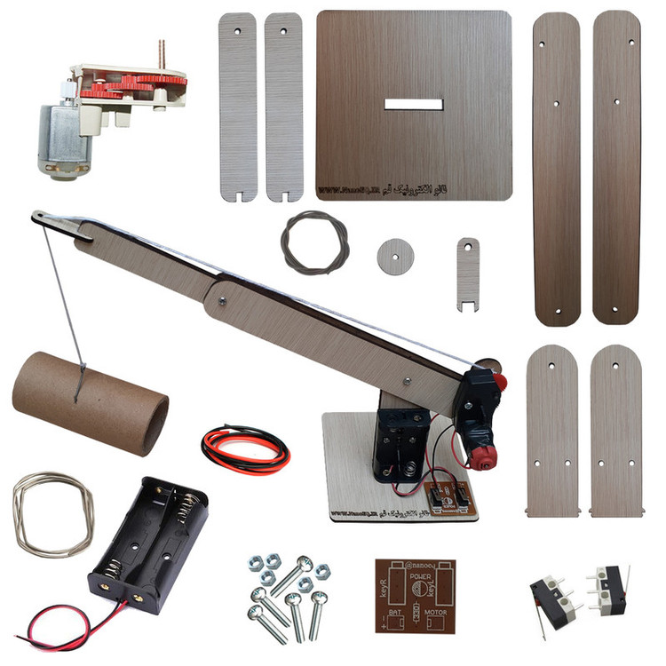 چوب برش خورده-پیچ و مهره-گیربکس و موتور-جاباتری قلمی-برد الکترونیکی-سیم-میکروسوئیچ-نخ و قلاب